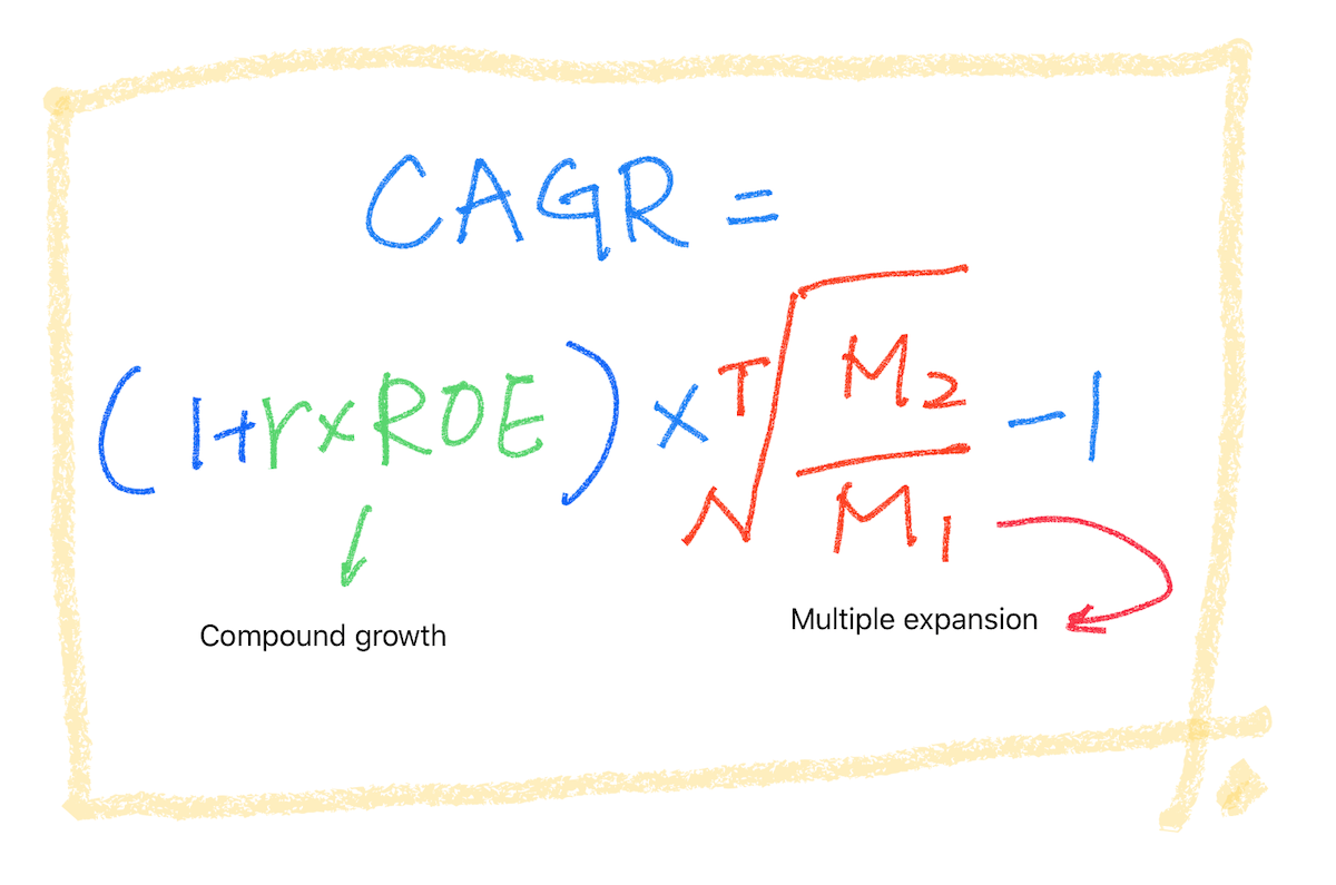 本篇文章的中文標題應該是:「估計長期投資的年複合報酬率的數學方程式」,因為這十幾個字實在太累贅了,葛八不得已只好簡化成「報酬方程式」,讓標題言簡意賅點。如果你看到這個方程式的第一點是有點嚇到、想關機,那千萬不要,因為看懂這個方程式對理解「長期投資」、「compound growth 複合成長」、市場的「multiple expansion 估值倍數」乃至整體報酬率的影響很重要,這個數學方程式幫助葛八了解長期投資的概念助益匪淺,葛八非常想要分享給你。